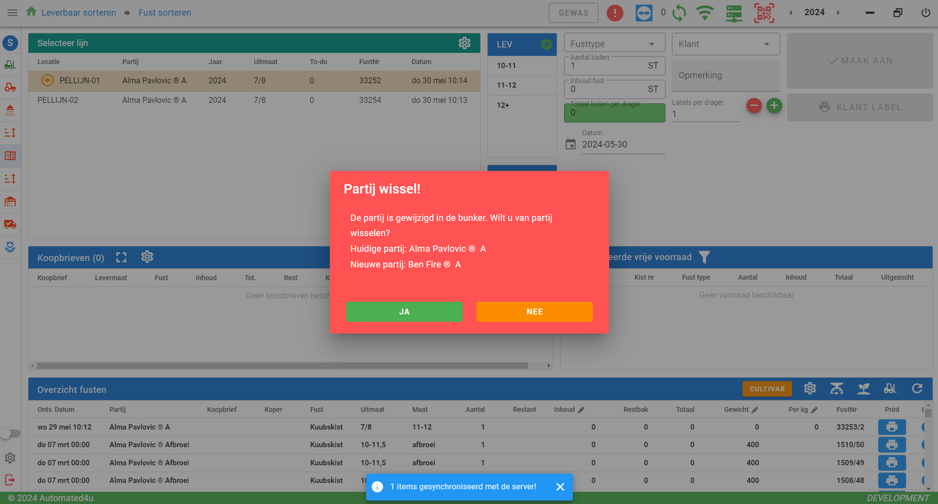 - Partij wissel beter inzichtelijk: Bij het aanmaken van labels wordt er automatisch een melding gegeven van partijwissels, in plaats van alleen bij de heftruckchauffeur.