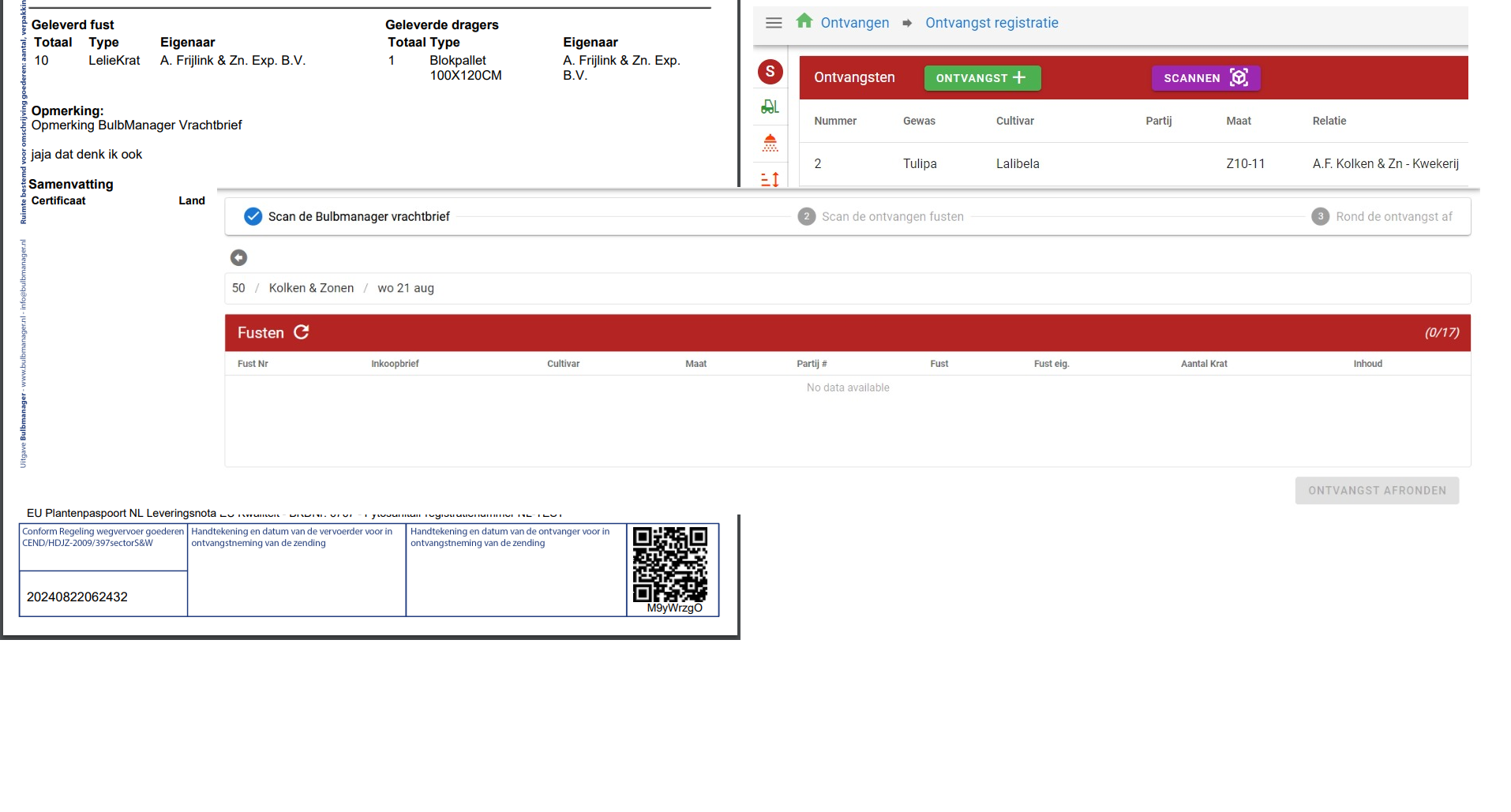 - Automatische registratie: Door de QR-code van een Bulbmanager vrachtbrief te scannen en daarna de fusten te scannen, worden alle gegevens automatisch in het systeem geregistreerd.